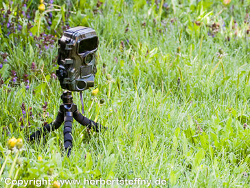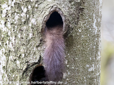 Für meinen Vogelkalender brauchte ich ein besseres Bild vom Schwarzspecht. Dazu hatte ich bereits vor einiger Zeit oberhalb des Titisees eine vielversprechende Gruppe von Buchen in einem Fichtenwald ausgespäht, die einige der hochovalen Spechthöhlen in rund 12 Meter Höhe aufwiesen. Einige Male hatte ich bereits hier nicht nur den Schwarzen rufen hören, sondern auch in unmittelbarer Umgebung gesichtet. Um zu optimalen und aussagekräftigen Fotos zu gelangen, plante ich ein Versteck auf Augenhöhe mit den Löchern in rund 30 Meter Entfernung im gegenüberliegenden Steilhang. Kein Problem für ein langes Tele-Objektiv auf dem Stativ. Am frühen Nachmittag durchflutete zudem die Sonne den Forst und leuchtete das Szenario einigermaßen gut aus.