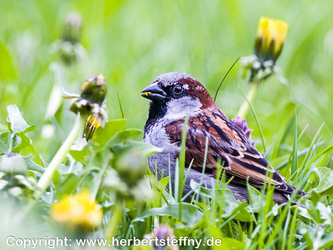 Natürlich sinnierte ich zwischenzeitlich, ob es nicht doch ein Spatz war. Rund eine Stunde später kontrollierte ich erneut meine Wiese. Da waren doch wirklich einige Haussperlinge im Rasen, die die Blütenknospen von Löwenzahn benagten. Also war meine Beobachtung dann wohl doch ein Spatz?! Schon wollte ich mich mit der Täuschung abfinden, als ich meinen Augen nicht traute: etwas weiter hinten war was anderes im Gras, tatsächlich ein Wendehals! Diesmal war aber die Kamera in Griffweite. Um nicht zu stören musste ich leider durch die Fensterscheibe fotografieren. Das ist zwar optisch suboptimal, aber egal, zumindest brauchte ich ein Belegfoto! Es gelangen mir in der Folge sogar eine Serie von Bildern, darunter einige brauchbare. Da hatte ich also doch das richtige Gefühl gehabt. Der Wendehals ist damit die Art Nummer 56, die ich in meinem Garten in Titisee beobachten konnte!
